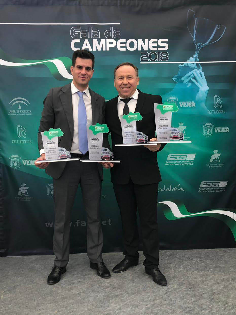 José Antonio Aznar y José Crisanto Galán recibieron el domingo 10 de febrero, en Vejer, los trofeos que les acreditan como Campeones de Andalucía de Rallyes del 2018 y vencedores en la clase VIII del certamen. La entrega de los galardones tuvo lugar en el transcurso de la Gala de Campeones de la Federación Andaluza de Automovilismo, que tuvo este año como escenario el recinto ferial de La Noria, en Vejer.